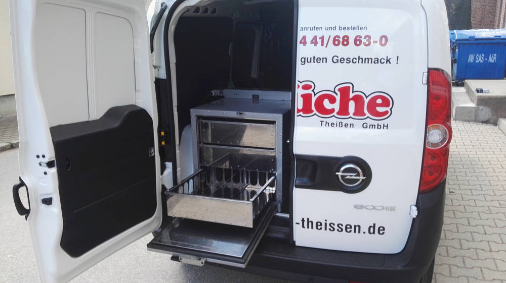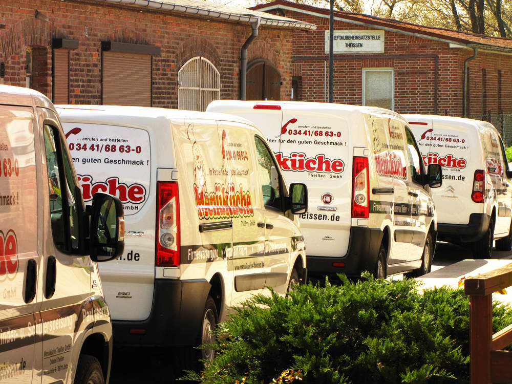Die Verteilung der Speisen an die verschiedenen Kunden und Einrichtungen erfolgt durch einen eigenen, leistungsfähigen Fuhrpark mit 10 Fahrzeugen. Die Fahrzeuge sind mit Cabo-Warmhalteöfen ausgerüstet, damit die Einzelportionen in den Menüschalen heiß beim Kunden ankommen.